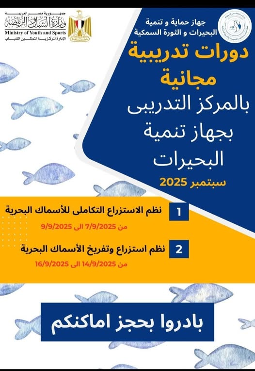 يعلن جهاز حماية وتنمية البحيرات والثروة السمكية بالتعاون مع وزارة الشباب والرياضة عن دورات تدريبية مجانية بالمركز التدريبي بالديوان العام للجهاز بالتجمع الخامس عن نظم الاستزراع التكاملي للأسماك البحرية