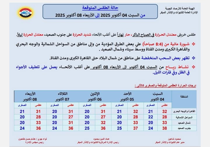 حالة الطقس المتوقعة من السبت 04 اكتوبر 2025 الى الاربعاء 08 اكتوبر 2025