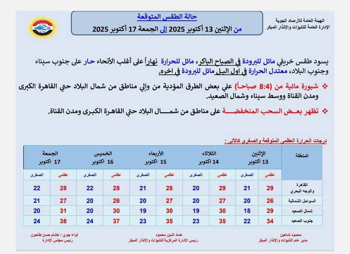 حالة الطقس المتوقعة من الاثنين 13 اكتوبر 2025 الى الجمعة 17 اكتوبر 2025