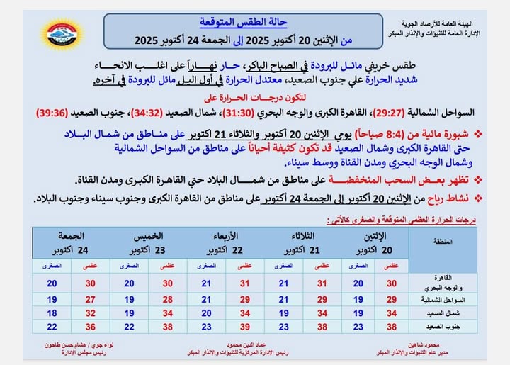 حالة الطقس المتوقعة من الاثنين 20 اكتوبر 2025 الى الجمعة 24 اكتوبر 2025